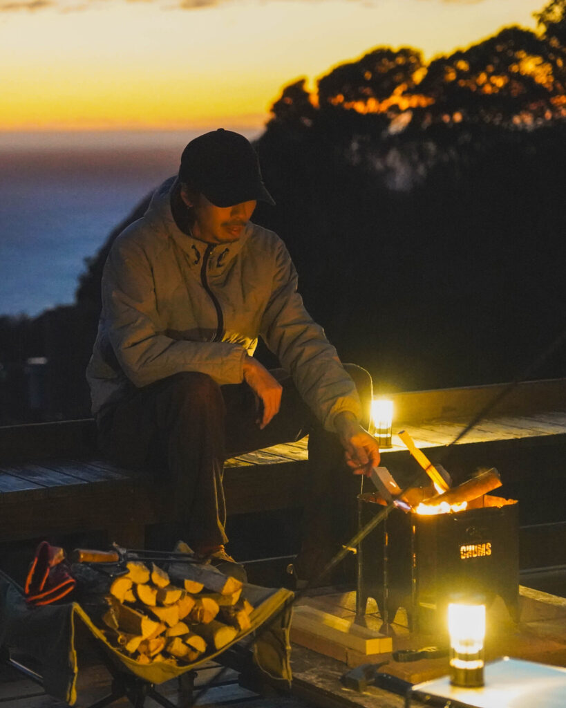 夕暮れの静かな時間、焚き火のあたたかさに包まれるひととき。